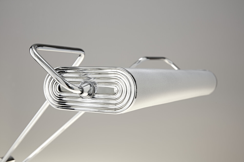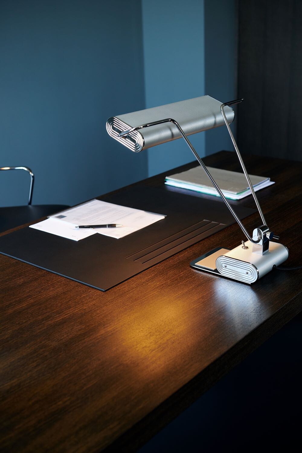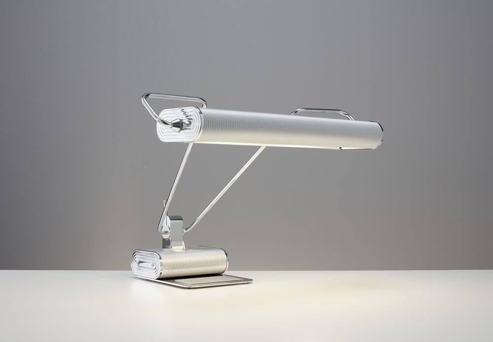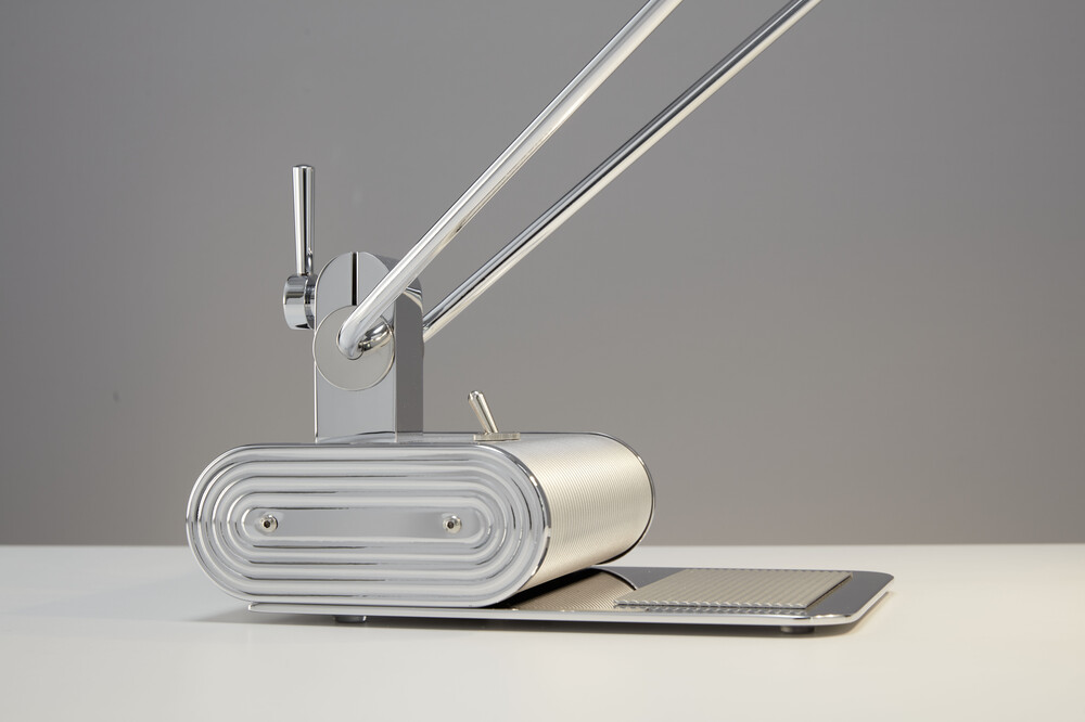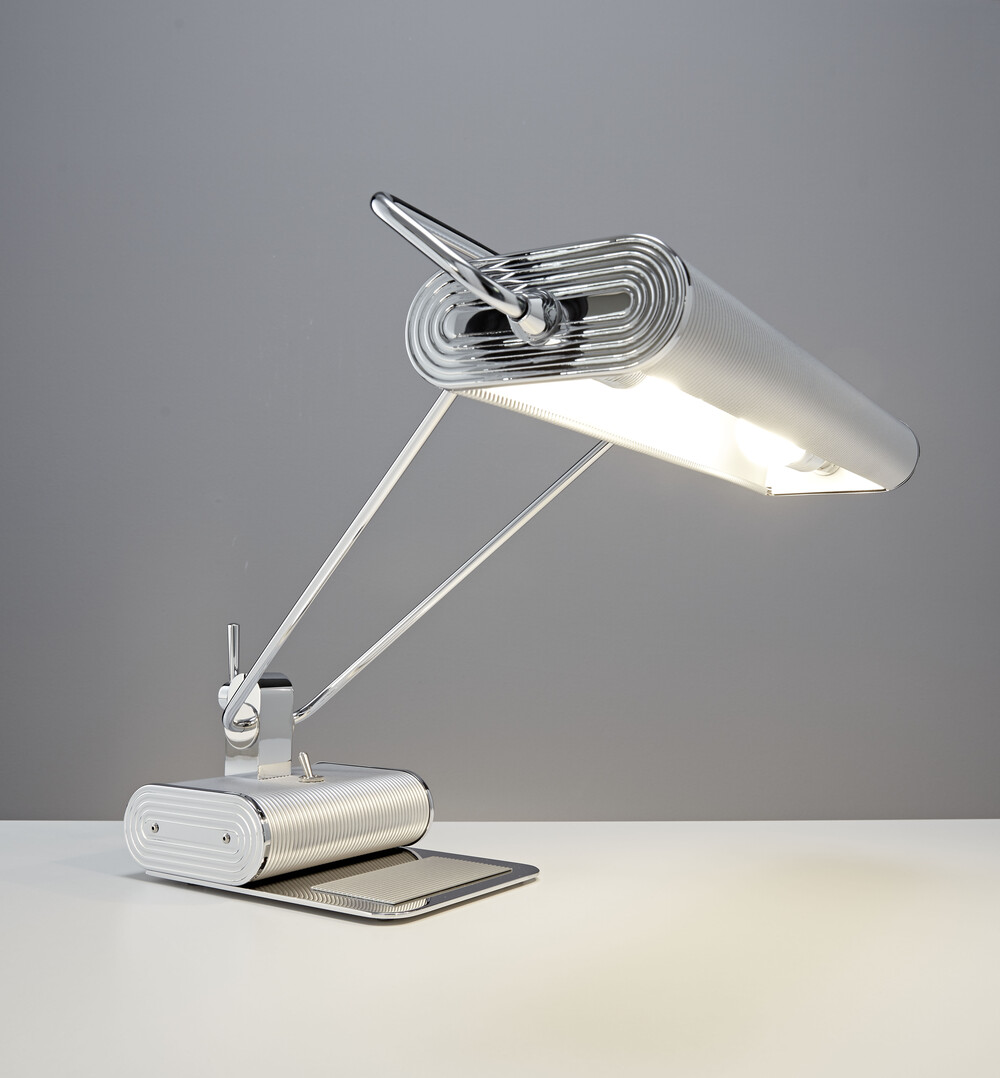 Art Deco 디자인으로 알려져 있는 이 데스크 램프는 1934년 디자인 제품입니다. 크롬과 알루미늄으로 마감되어있으며 하단의 무게감있는 플레이트가 전체적인 무게중심을 잡아주며 높이 조절과 조명의 각도조절을 어렵지 않게 합니다.
