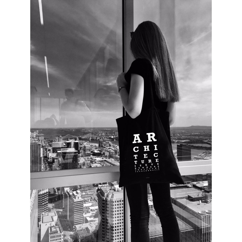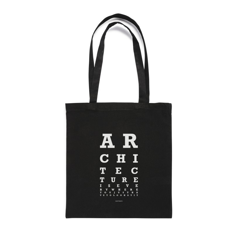 건축과 연관되어있는 스펠링이 시력검사하듯 디자인 프린트 된 에코백입니다.