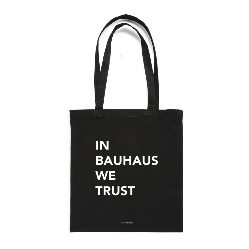 IN BAUHAUS WE TRUST 의 텍스트가 프린트 된 심플한 디자인의 에코백입니다.