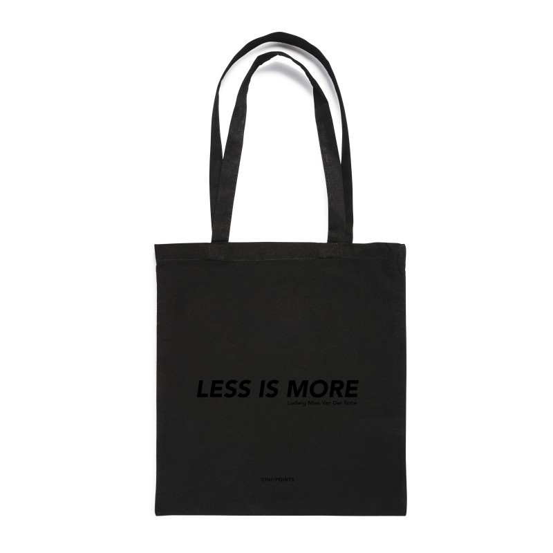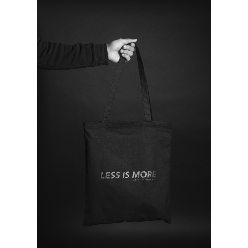 LESS IS MORE의 텍스트가 블랙색상의 유광으로 인쇄된 심플하면서도 멋스러운 에코백입니다.