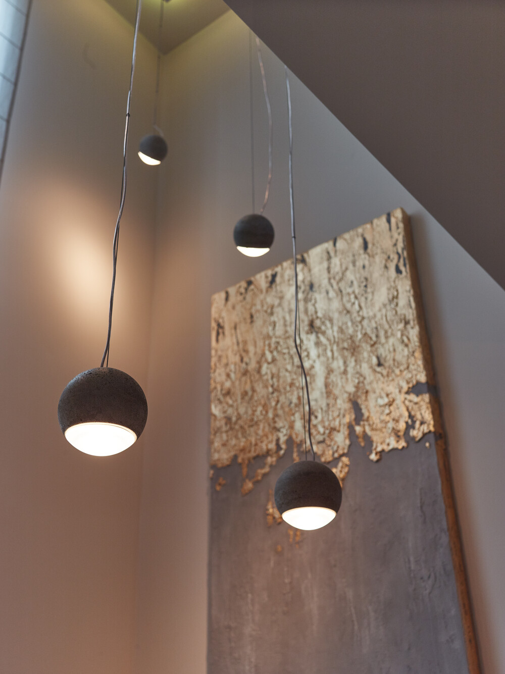 디자이너는 콘크리트를 기계로 작업하지 않고 대신 손으로 부어서 압축하여 매우 매끄러운 구형 표면이 불규칙한 구멍과 에어포켓을 만들어냈습니다. 생생한 표면의 질감은 이 디자인을 고유한 디자인으로 만들어줍니다.