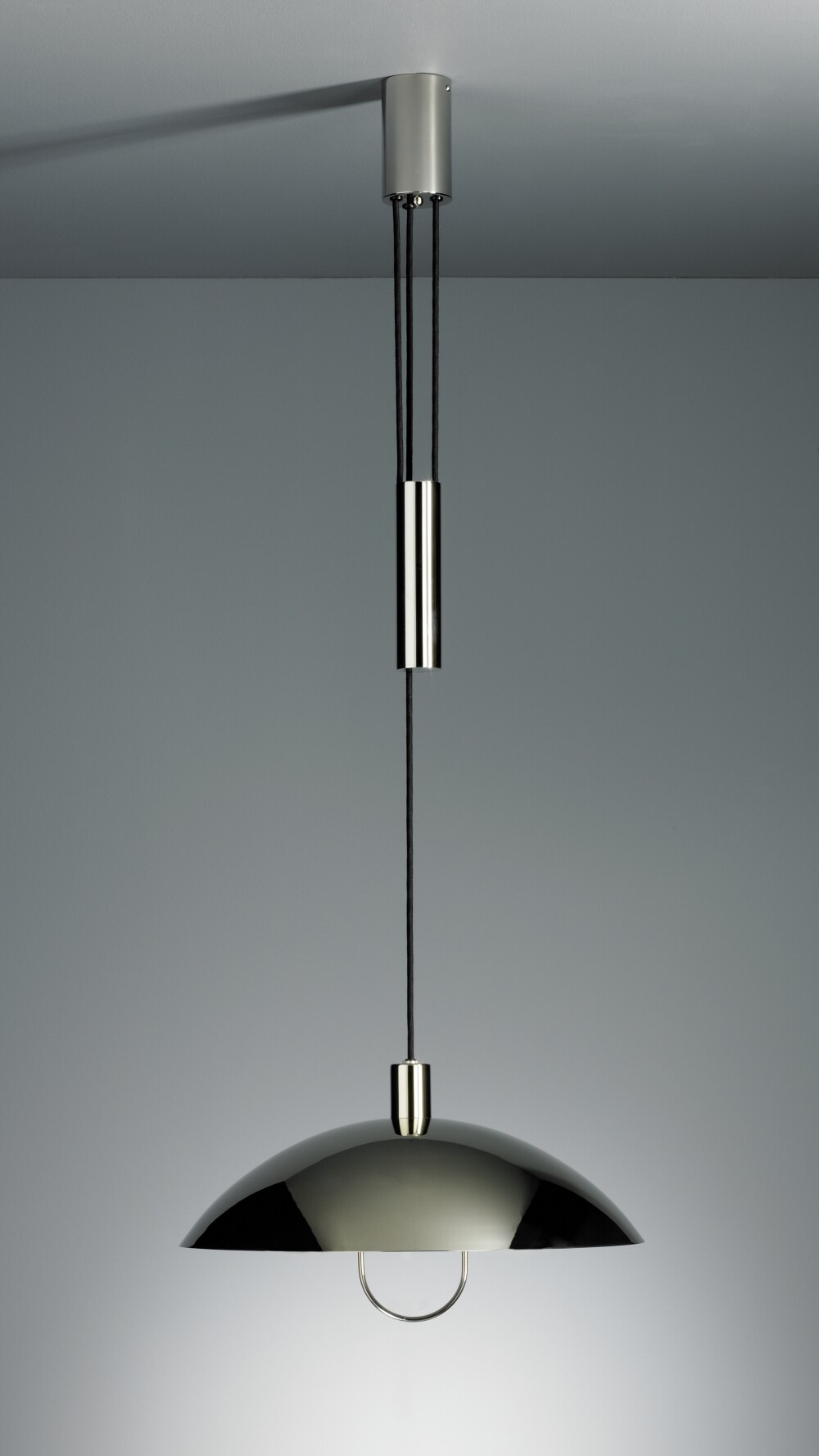 바우하우스의 가장 대표적인 디자이너 중 하나인 마리안느 브란트 Marianne Brandt 의 1925년 디자인 제품입니다. 니켈로 마감되어있으며 추가 있는 타입과 없는 타입이 있습니다. 추와 손잡이를 이용해 부드럽게 높이 조절이 가능합니다. 빛을 부드럽게 반사하여 발산하는 타입으로 니켈의 장점을 보여주는 디자인입니다.