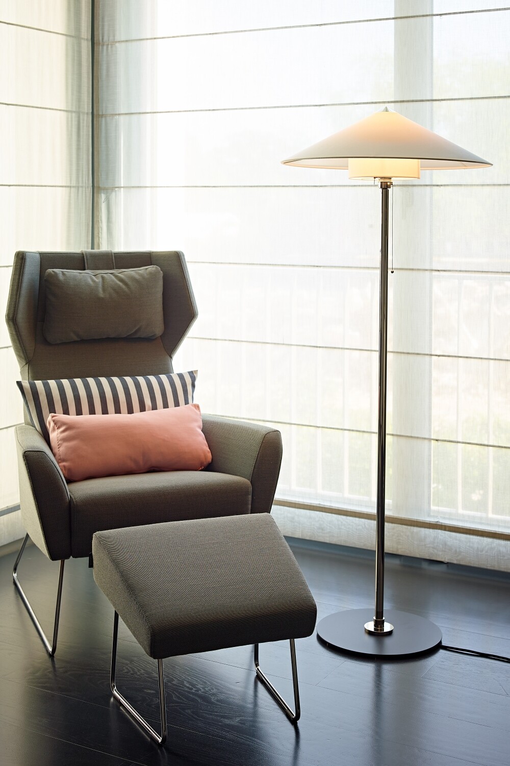 1930년 빌헬름 바겐펠트 Wilhelm Wagenfeld의 디자인 제품입니다. 페브릭 재질로 된 갓을 통해 빛이 은은하게 퍼지며 페브릭은 단단하게 가공된 재질로 오염이나 먼지에 강합니다. 하단의 플레이트는 무게감이 있어 전체적인 무게중심을 안정적이게 잡아줍니다. 갓 상단의 스틸로 마감된 팁의 디테일이 있어 제품을 더욱 돋보이게 하며 같은 시리즈의 테이블램프 제품으로 WG27 이 있습니다.