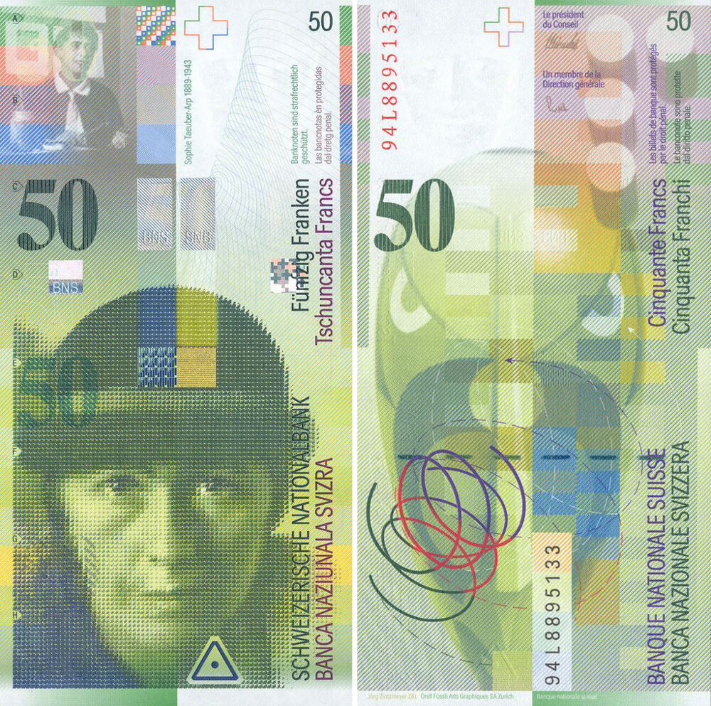 스위스 지폐 속 예술가 중 한 명인 Sophie Taeuber-Arp는 뮌헨에서 교육을 받은 후 1914년 고향 스위스로 돌아와 성공적인 응용 예술 활동을 시작했습니다. 1915년 전시회에서 독일-프랑스 예술가 Jean Arp를 만나 결혼하였으며 1916년에 시작된 '다다 운동' 에 참여하게되었고 가장 유명한 작품인 다다헤드 (Tête Dada; 1920)는 이 시기에 탄생했습니다. 그들은 1926년 프랑스로 이주하여 2차 세계 대전 중에 프랑스가 침공될 때까지 그곳에 머물렀으며 스위스로 다시 돌아갔습니다. 1943년 사고로 사망 후 Jean Arp의 아내로 가려졌지만 20세기 가장 중요한 예술가 중 한 명으로 여겨집니다.