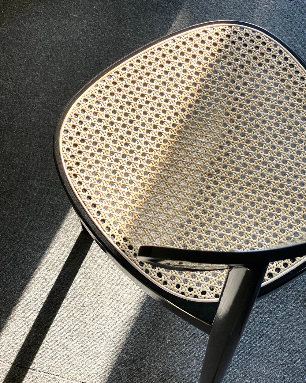 디자이너 Sebastian Herkner은 무게감은 덜어내고 세련된 디자인을 추가합니다. 또 다른 특별한 특징은 의자 다리의 모양입니다. 뒷면에 둥글고 앞면의 가장자리의 약간의 틈으로 말굽 모양의 받침대를 차지합니다. Thonet 214 체어와 같이 시트 부분은 손으로 짜여진 CANE으로 마감되어있습니다.